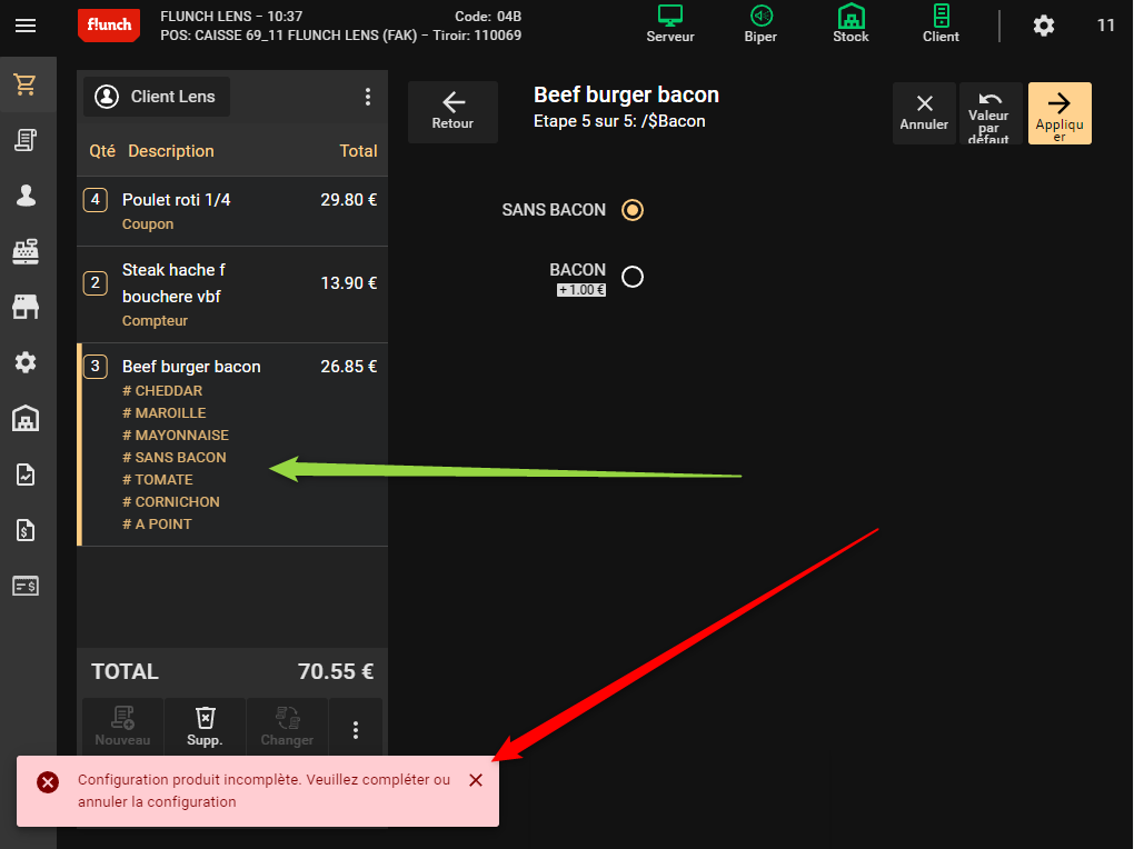 The product appears on the ticket (POS screen) as not complete (biper is mandatory)Cashier can click on each product to fill in the missing information.
