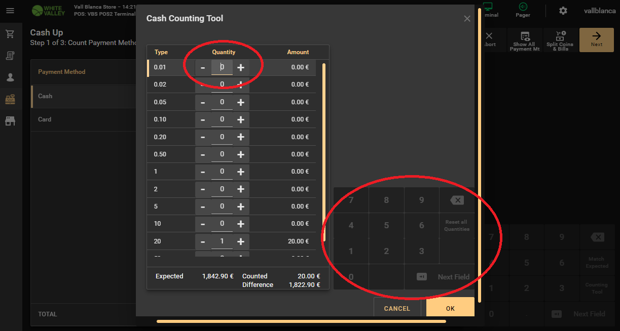 DescriptionWhen Cashing up for a second time, if I have to fill a value in the first field "Quantity" for "Type" "0.01" the keypad does not activate. I have to first go to another field and then when returning to the first one the keypad is active as it should have been from the very beginning.