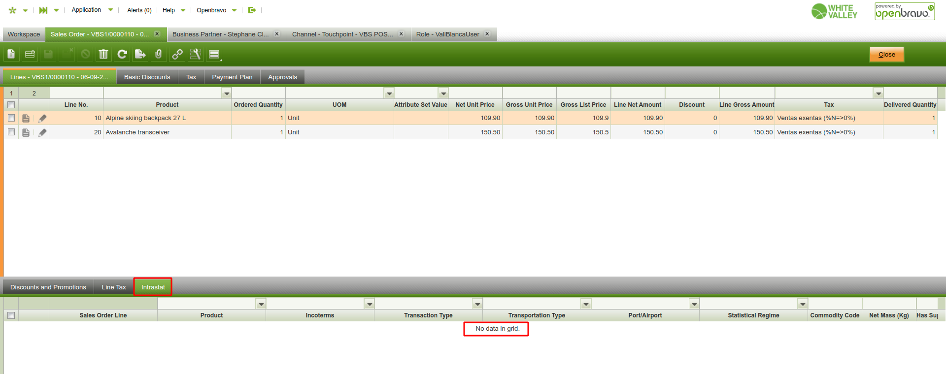5 - Notice that the sales order created in the previous point, its lines do not contain records in the "Intrastat" tab.