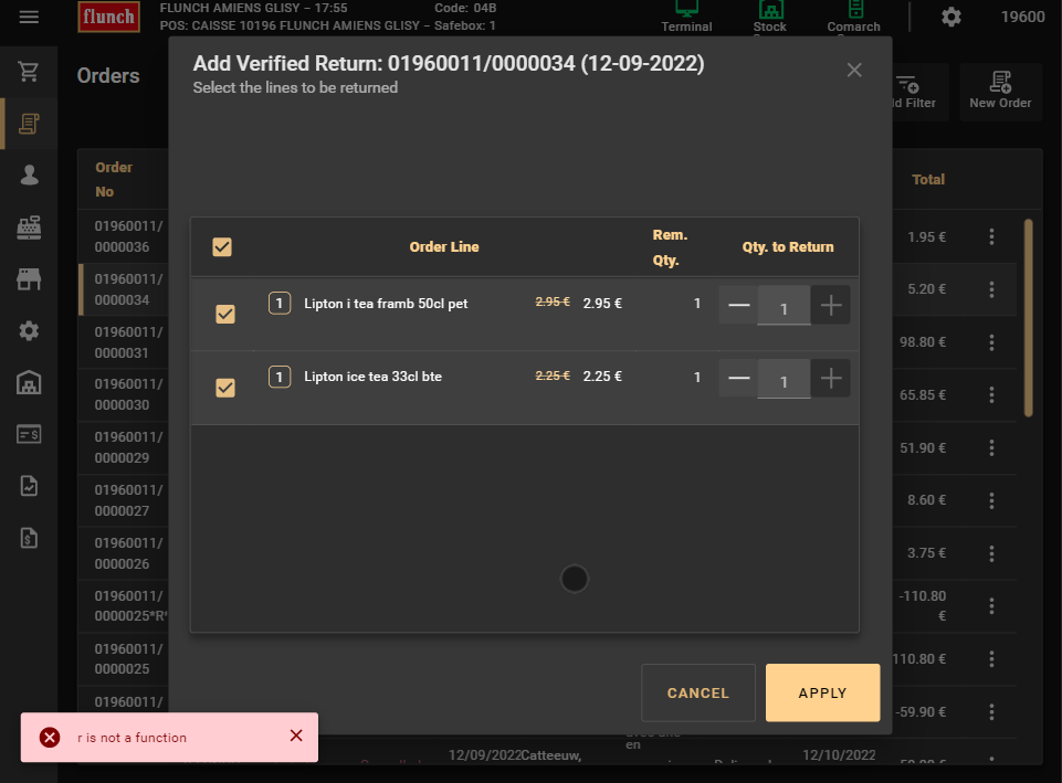 | Description | When I select an old paid transaction in the order screen, I can’t do a verified return, an error appear whatever I select. | |||||||