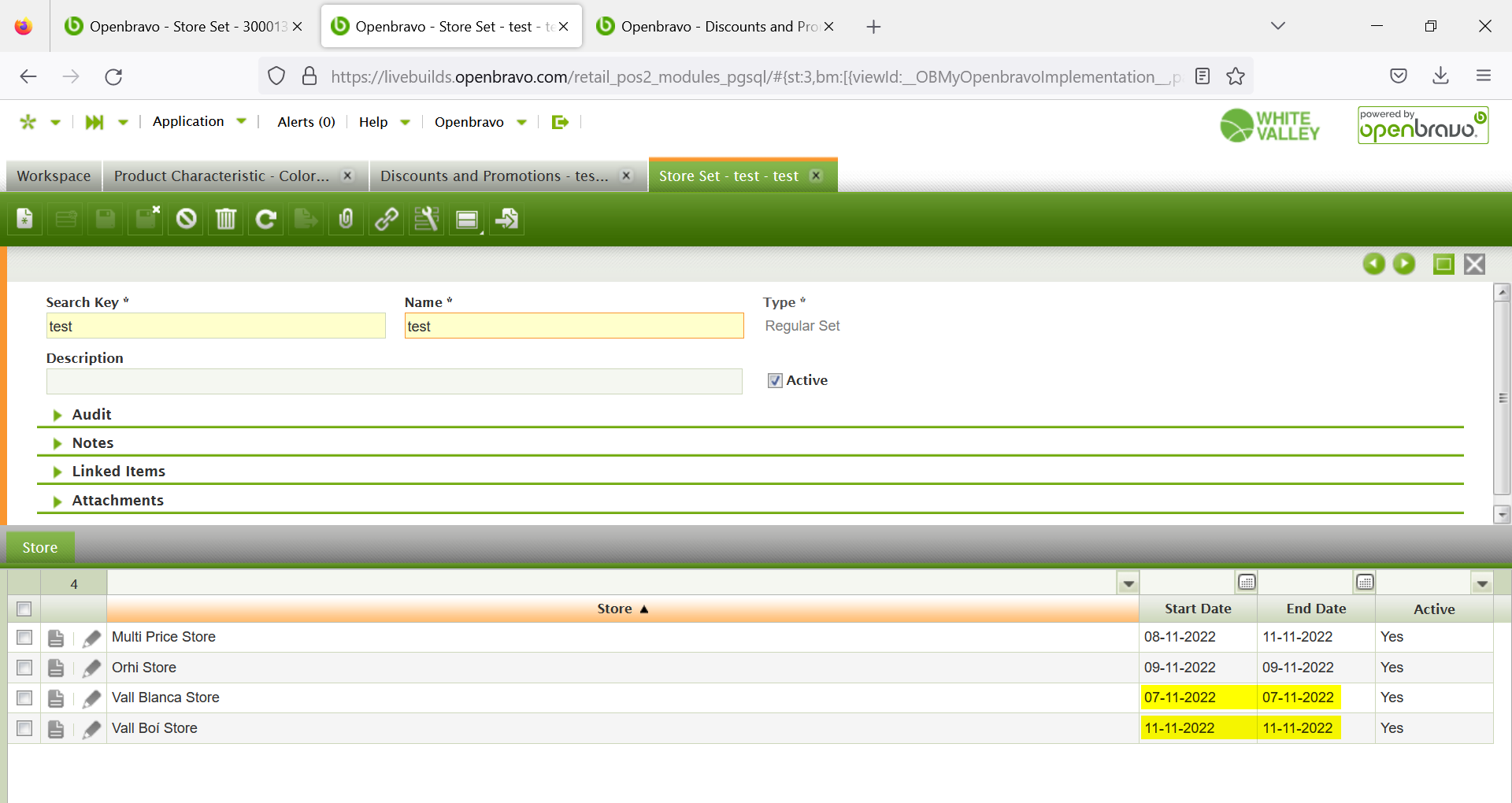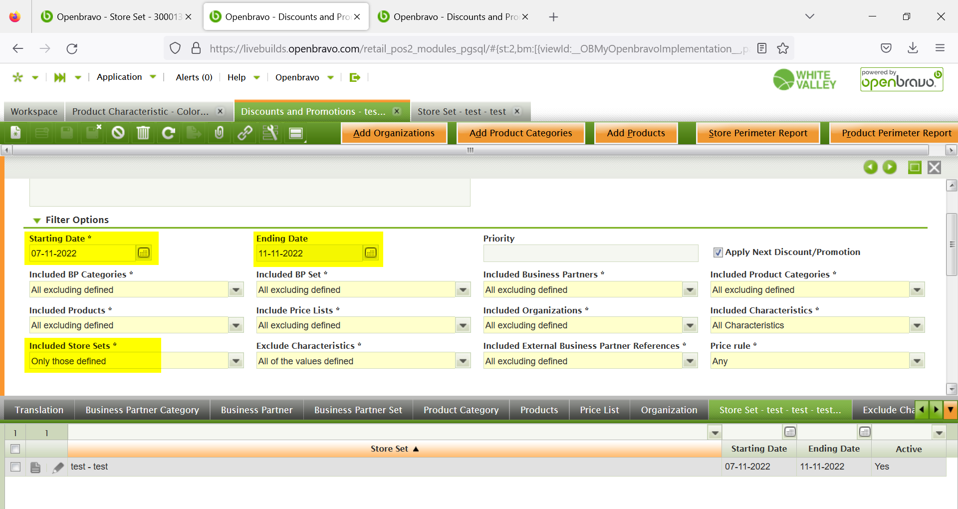 | Steps To Reproduce | In Openbravo backoffice, go to 'Store Set' window Create a store set with 4 stores and dates defined as below : - 1 store A start date = end date = start date of promotion - 1 store B start date = end date = end date of promotion - 1 store C start date = end date > start date of promotion and < end date of promotion - 1 store D start date > start date of promotion and end date = end date of promotion (see store set.png) Go to 'Discounts and promotions' window Create a record with : - starting date - ending date - Included Store Set = Only those defined - In Store Set subtab, add the previous store set (see promotion.png) Click on 'Store Perimeter Report' button A csv file is generated => Store A with start + end date in store set = start date of promotion is not in the file => Store B with start + end date in store set = end date of promotion is not in the file (see store perimeter.png) | |||||||