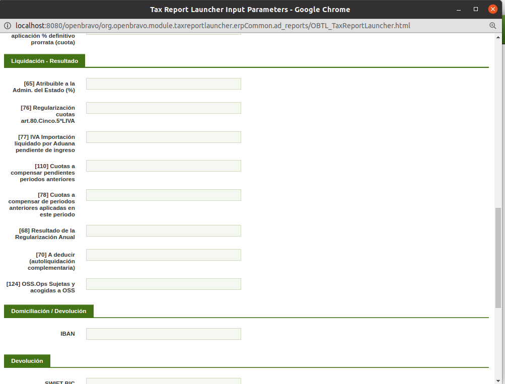 | Proposed Solution | See : https://sede.agenciatributaria.gob.es/Sede/ayuda/disenos-registro/modelos-300-399.html [^] (303 actualizado con fecha 09/02/2022. Ver adjunto) Nuevo datasets 303 2023 tanto para el Modelo mensual como trimestral: Modelo 303 2023 - Autoliquidación Mensual del IVA Modelo 303 2023 - Autoliquidación Trimestral del IVA Modelo 303 2023: Ultimo Periodo - Autoliquidación Mensual del IVA Modelo 303 2023: Ultimo Periodo - Autoliquidación Trimestral del IVA Nuevo diseño de registro: Pagina 0 - no hay cambios Pagina 1 Posición 118+8 - Identificación (1) - Fecha en que se dictó el auto de declaración de concurso, incluye un formato fijo de fecha "DDMMYYYY", por tanto incluir validación en el parámetro de entrada "ConcursoDate", del grupo de parámetros "Identificación" Nuevas casillas para los nuevos tipos de venta en régimen general de 0% y de 5%, que se tendrán que relacionar con el parámetro "IVA Devengado - Régimen General" de tipo Output. Los importes (bases, tipo % y cuota) correspondientes se tendrán que reflejar en las posiciones: Posición 130 +17 (num) - Liquidación (3) - Regimen General - IVA Devengado - Régimen general - Base imponible - casilla [150] Posición 147+ 5 - (num) - Liquidación (3) - Regimen General - IVA Devengado - Régimen general - Tipo % - casilla [151] - SE RESERVA PARA EL TIPO 0% (00000) Posición 152 +17 (num) - Liquidación (3) - Regimen General - IVA Devengado - Régimen general - Cuota - casilla [152] Posición 208 +17 (num) - Liquidación (3) - Regimen General - IVA Devengado - Régimen general - Base imponible [153] Posición 225 +5 (num) Liquidación (3) - Regimen General - IVA Devengado - Régimen general - Tipo % [154] SE RESERVA PARA EL TIPO 5% (00500) Posición 230 +17 (num) - Liquidación (3) - Regimen General - IVA Devengado - Régimen general - Cuota [155] Se reservan las casillas siguientes para los tipos de venta de régimen general: Posición 169 + 17 - TIPO 4%- base imponible - CASILLA 01 Posición 186 + 5 - TIPO 4% - tipo % (00400)- casilla 02 Posición 191 + 17 - TIPO 4%- cuota - CASILLA 03 Posición 247 + 17 TIPO 10%- base imponible - CASILLA 04 Posición 264 + 5 TIPO 10% - tipo % (01000)- casilla 05 Posición 269 + 17 TIPO 10%- cuota - CASILLA 06 Posición 286 + 17 TIPO 21%- base imponible - CASILLA 07 Posición 303 + 5 TIPO 21% - tipo % (02100)- casilla 08 Posición 308 + 17 -TIPO 21%- cuota - CASILLA 09 Se reservan las casillas siguientes para los tipos de venta de régimen general - RECARGO DE EQUIVALENCIA: Posición 427 + 17 - TIPO 1.75%- base imponible - NUEVA CASILLA 156 Posición 444 + 5 - TIPO 1.75% - tipo % (00175)- NUEVA casilla 157 Posición 449 + 17 TIPO 1.75%- cuota - NUEVA CASILLA 158 Casillas para el nuevo tipos de recargo de equivalencia del 0.62%, 0.5% Y 0% que se tendrán que relacionar con el parámetro "IVA Devengado - Recargo de Equivalencia" de tipo Output. Los importes (bases, tipo % y cuota) correspondientes se tendrán que reflejar en las posiciones: Posición 466 + 17 - TIPO 1.75%- base imponible - CASILLA 16 Posición 483 + 5 - TIPO 1.75% - tipo % (00175)- casilla 17 Posición 488 + 17 TIPO 1.75%- cuota - CASILLA 18 Se reservan las posiciones siguiente para los siguientes tipos de recargo de equivalencia: Posición 505 + 17 TIPO 1.4%- base imponible - CASILLA 19 Posición 522 + 17 TIPO 1.4% - tipo % (00140)- casilla 20 Posición 527 + 17 TIPO 1.4%- cuota - CASILLA 21 Posición 544 + 17 TIPO 5.20%- base imponible - CASILLA 22 Posición 561 + 17 TIPO 5.20% - tipo % (00520)- casilla 23 Posición 566 + 17 TIPO 5.20%- cuota - CASILLA 24 Incorporación de la cuota de dichas nuevas casillas en el total cuota devengada, casilla 27 : Liquidación (3) - Regimen General - IVA Devengado - Total cuota devengada ( [152]* + [03] + [155]* + [06] + [09] + [11] + [13] + [15] + [158]* + [18] + [21] + [24] + [26] ) [27] se mueven todas las posiciones hasta hacer un total de 1581 (revisar). Por último y conforme a la nota 7 - "Tributación exclusivamente a una Administración Foral. Todos los campos referenciados con la Nota 7, en el caso de de tributación exclusivamente a una Administración Foral, se podrán cumplimentarán con el valor "00000"" Si el usuario selecciona el parámetro "Tributa exclusivamente a una Admin.Foral con IVA importación liquidado pendiente de ingreso", las siguientes posiciones (tipos) se rellenar a ceros 00000: Posición 168+5, 225+5, 264+5, 303+5, 444+5, 483+5, 522+5 y 561+5 Pagina 3 Posición 340+17 - antes "Resultado - A deducir [70]", ahora "Resultado - Resultados a ingresar de anteriores autoliquidaciones o liquidaciones administrativas correspondientes al ejercicio y período objeto de la autoliquidación [70]. Este cambio implica que el parámetro "ComplementaryAmt" del grupo de parámetros "Difference" (Liquidación - Resultado) se tiene que renombrar como: "[70] Resultados a ingresar pendientes de liquidación" tanto en su definición (ventana Tax Report) como al lanzar cualquier 303 desde la ventana "Tax Report Launcher". Ver imagen adjunta. Posición 357+17 - Resultado - Devoluciones acordadas por la Agencia Tributaria como consecuencia de la tramitación de anteriores autoliquidaciones correspondientes al ejercicio y período objeto de la autoliquidación [109]. Este cambio implica la creación de un nuevo parámetro de entrada denominado : "[109] Devoluciones de la AEAT pendientes de liquidación" dentro del grupo de parámetros "Difference" (Liquidación - Resultado), con la siguiente configuración: Search Key = PendingReturns Name = [109] Devoluciones de la AEAT pendientes de liquidación Description = [109] Resultado - Devoluciones acordadas por la Agencia Tributaria como consecuencia de la tramitación de anteriores autoliquidaciones correspondientes al ejercicio y período objeto de la autoliquidación Type = Input Este nuevo parámetro de entrada se tiene que mostrar al lanzar cualquier 303 (mensual, trimestral, último periodo mensual, último 
