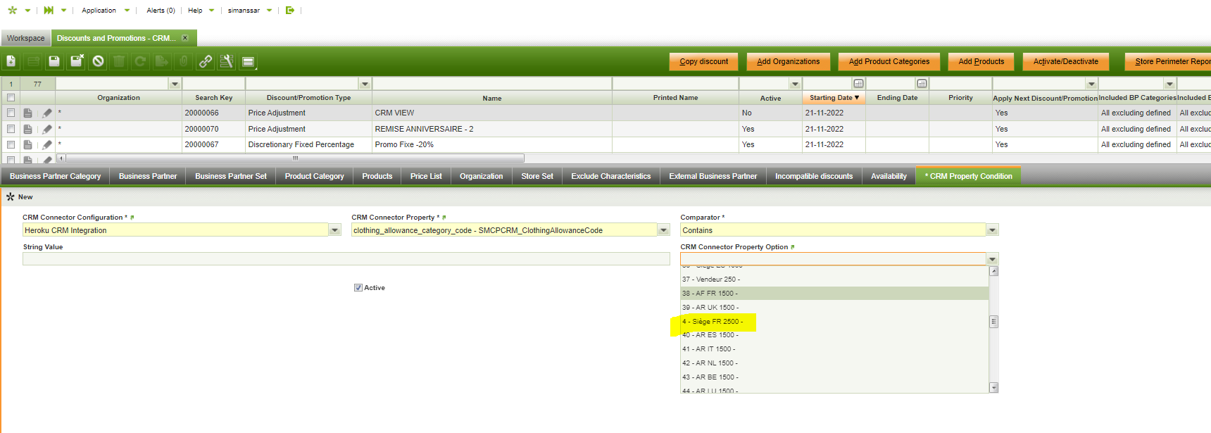 | Steps To Reproduce | To visualize the dropdown list : - go to the window Discount and Promotions - create a promotion - go to the sub window CRM Property Condition - in "CRM Connector Configuration" put "Heroku CRM Integration" - in "CRM Connector Property" put "clothing_allowance_category_code" (this is an example) - in "Comparator" put "Contains" - in "CRM Connector Property Option" --> you can see the dropdown list we would like to have in ascending order following the sequence number. To visualize the sequence order : - go to window "CRM Connector configuration" - go to sub window "API Property" - go to sub window "Property Options" - Here you can see the sequence number for each options | |||||||