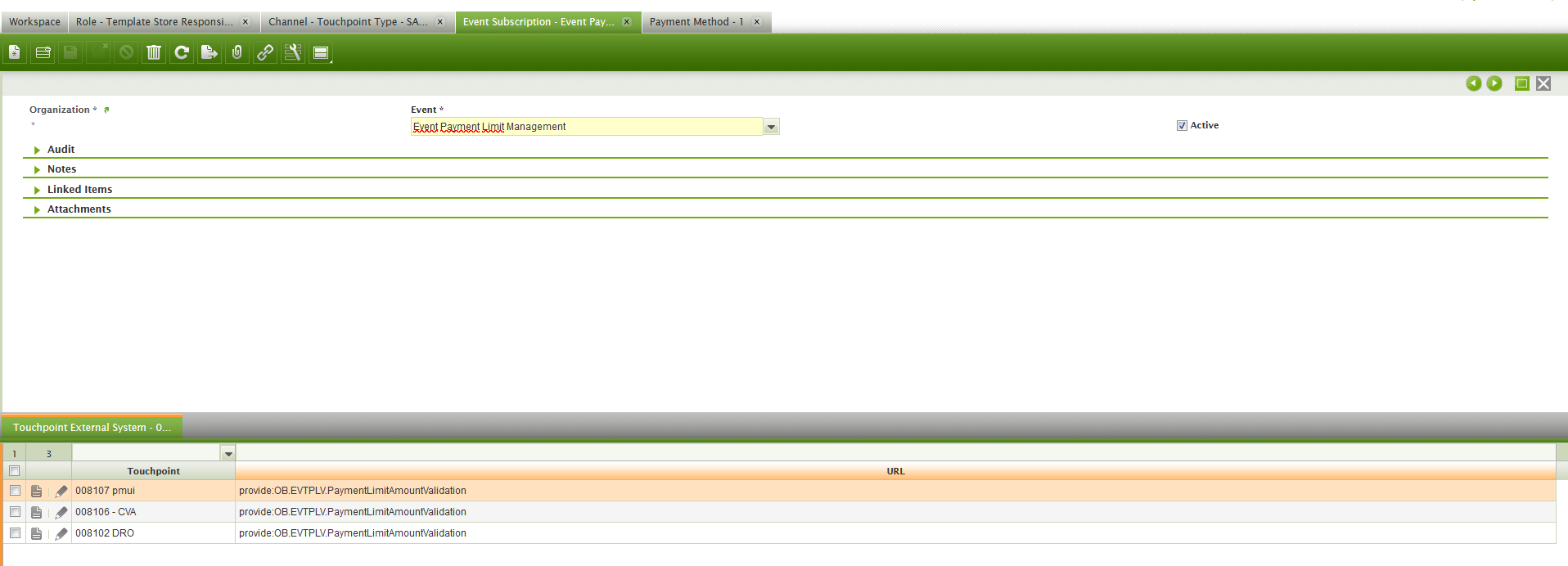 | Steps To Reproduce | 1) Go to Event Subscription window 2) When selecting Event = Evbent Payment Limit Management, you are obliged to fill in the subtab the Touchpoint External System: there you need to put touchpoint by touchpoint | |||||||