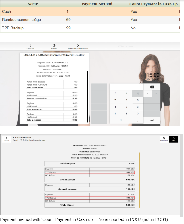 | Description | Payments methods with payments in the session but ‘Count Payment in Cash up’ = No are displayed in the report cash up POS2 In pos 1 it is not displayed | |||||||