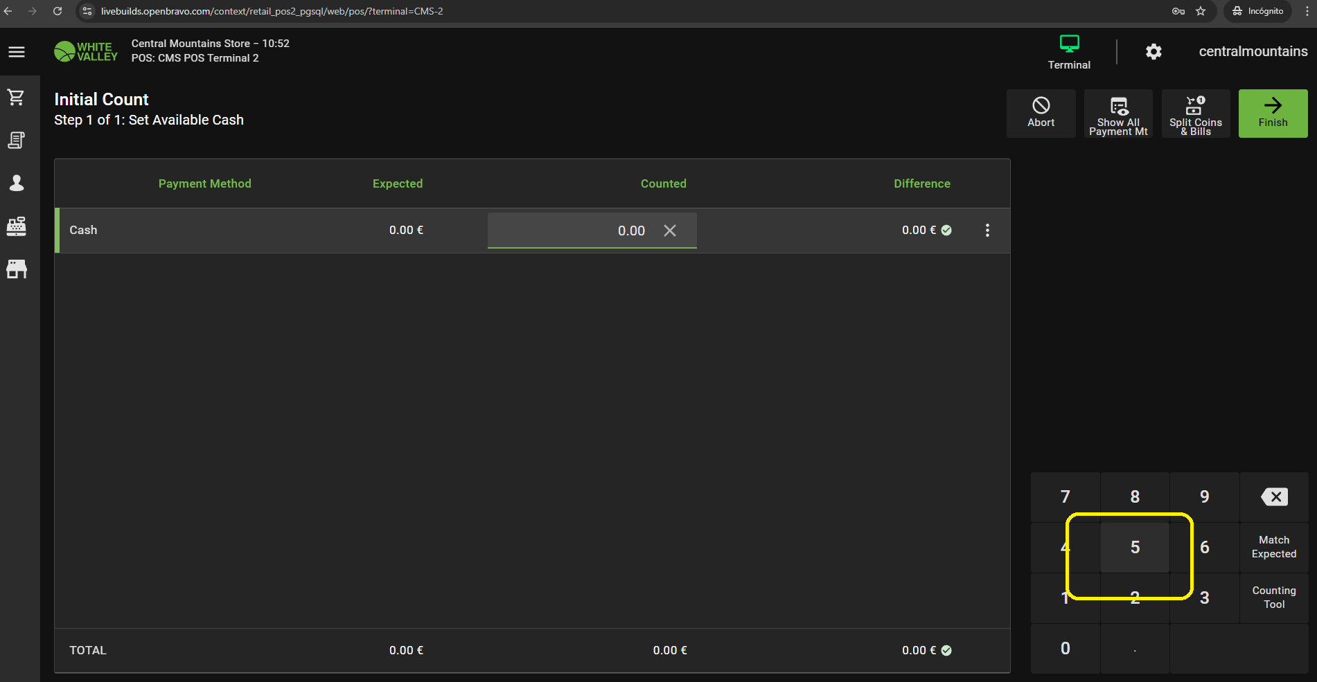 | Steps To Reproduce | 0-Login POS as centralmountains using CMS-2 terminal. 1-Initial Count process will be initiated and "Step 1 of 1: Set Available Cash" will be shown. There, click any keypad button at the bottom right of the POS screen and realise it stays pressed. In case it is not reproducible following this last step, do the following: Execute the click (mousedown event) inside any keypad button, such as "5" button, and finish the mouseup event outside that button (outside the container where the click was started). | |||||||||||