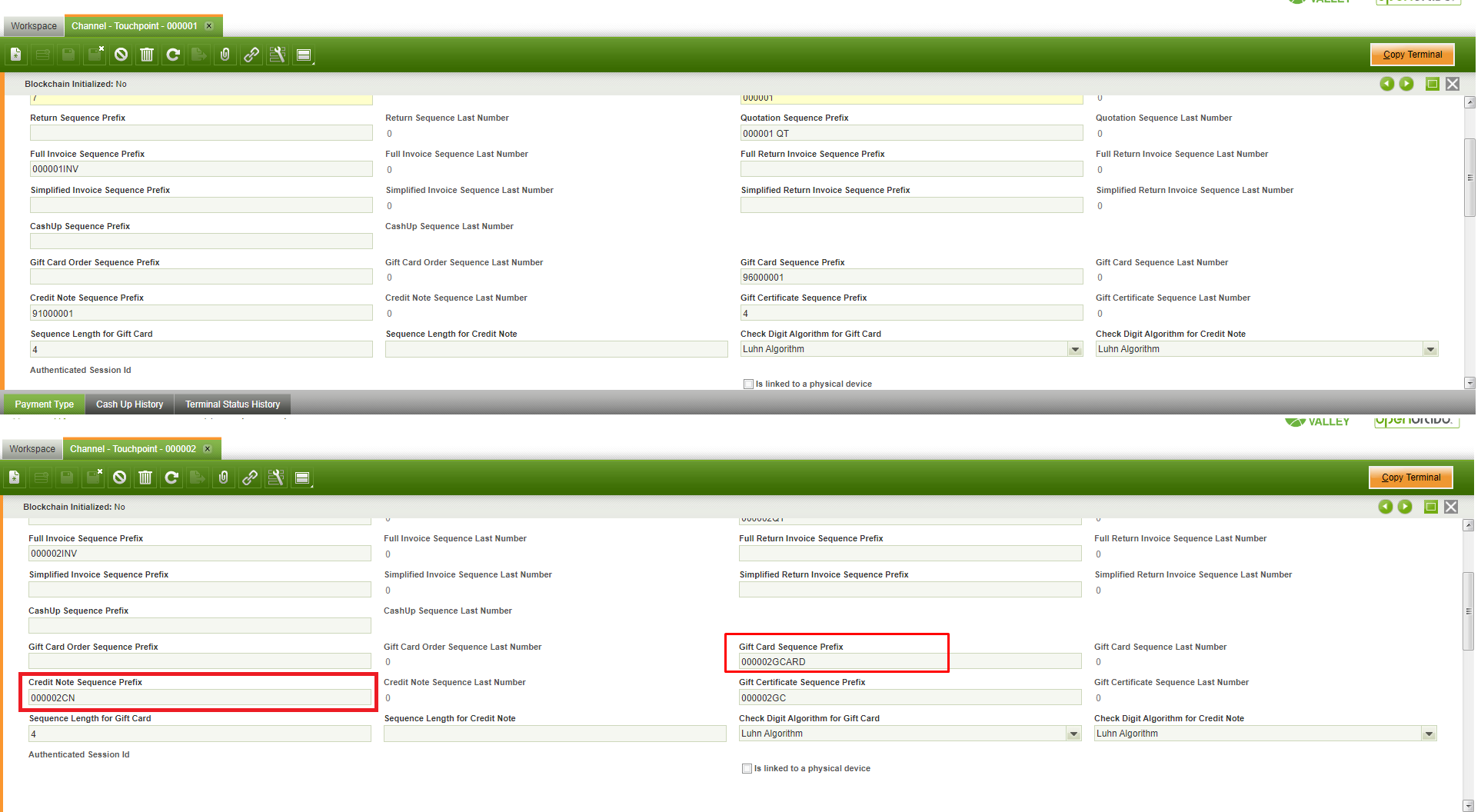 | Steps To Reproduce | On a organization with a single touchpoint, set the Credit Note Sequence Prefix to, for example 91000001 and Gift Card Sequence Prefix to 96000001. Then copy this terminal doing Copy terminal. On a organization with a single touchpoint, set the Credit Note Sequence Prefix to, for example 91000001 and Gift Card Sequence Prefix to 96000001. Then copy the store doing Copy Retail Store. | |||||||
