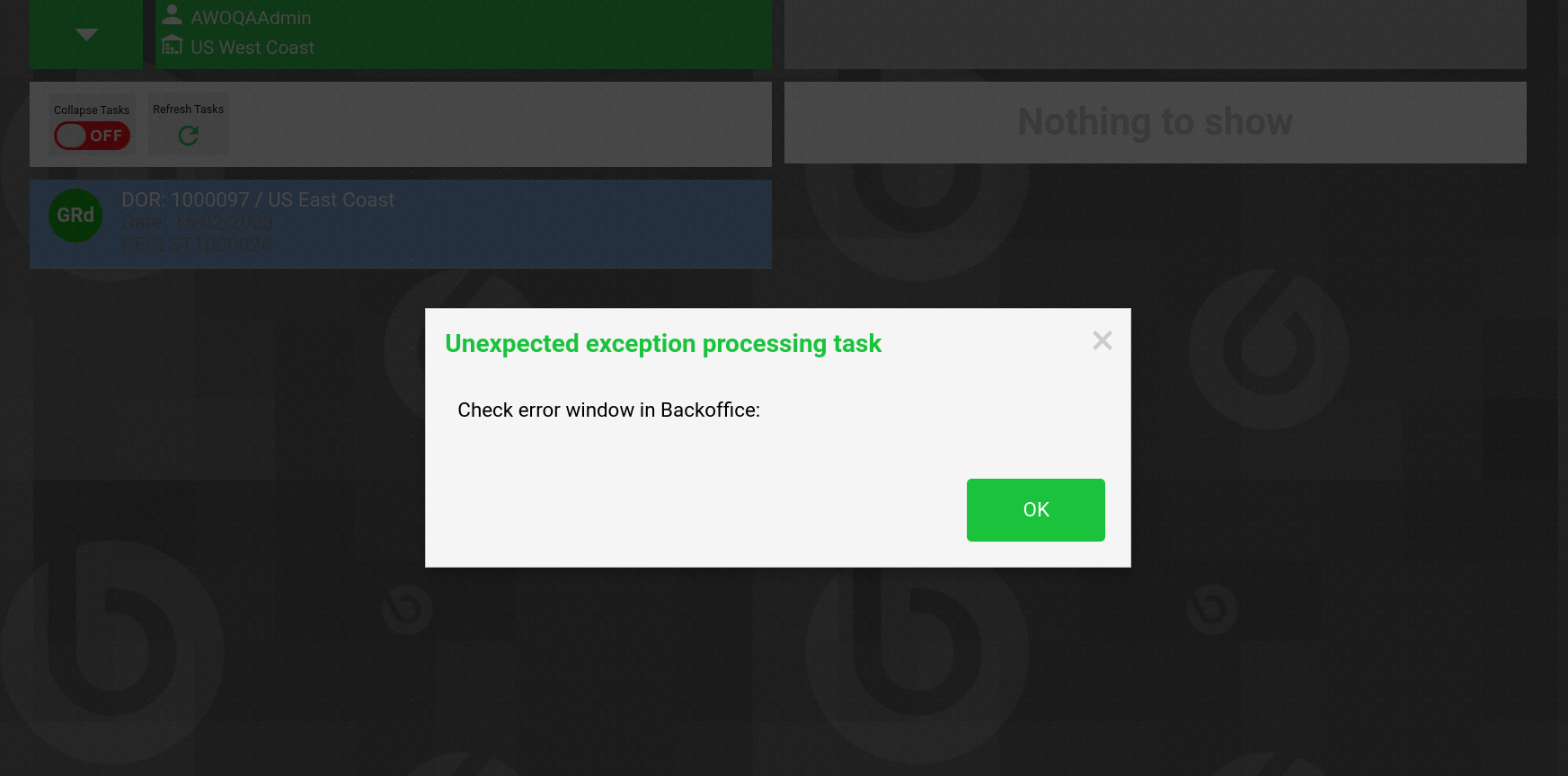 | Steps To Reproduce | 0-Using AWO sampledata, login Backoffice as AWOQAAdmin. 1-Go to Sales Order window. 2-Create a new record and fill it with the following data: --- Organization: US Business Partner: Healthy Food Supermarkets, Co. Warehouse: US West Coast --- Save the record. 3-Go to Lines tab and create a new record with the following data: --- Product: Apple Operative Quantity: 30 --- Save the record and book it. 4-Click Issue process and choose to assigne it to AWOQAAdmin. Click Done. Process will be successfully executed. 5-Now, login AWO frontend as AWOQAAdmin. 6-Go to profile and be sure the following configuration is set (otherwise, set it as follows): --- Role: AWO-QA Admin - AWO-QA Organization: * Warehouse: US West Coast --- 7-Watch the task previosly created with that Sales Order and click on it. 8-Now, click in Quantity input field to set the focus there. 9-Set in that input field "7777777" and quickly press Confirm button. DEFECT: In case that process has been done fast enough, the application will show an error (check attached image). | |||||||||||