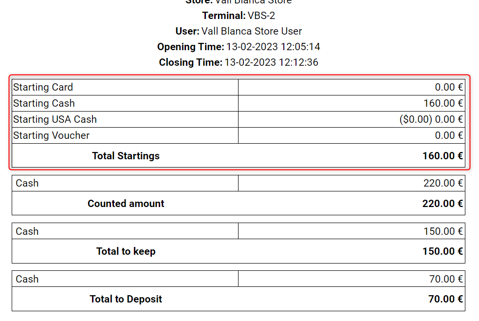 DescriptionBecause of the preferences ‘Hide count Information to cashier' and 'Hide cashup information to cashier' = Y, we should not see the starting rows in the POS report cashup
