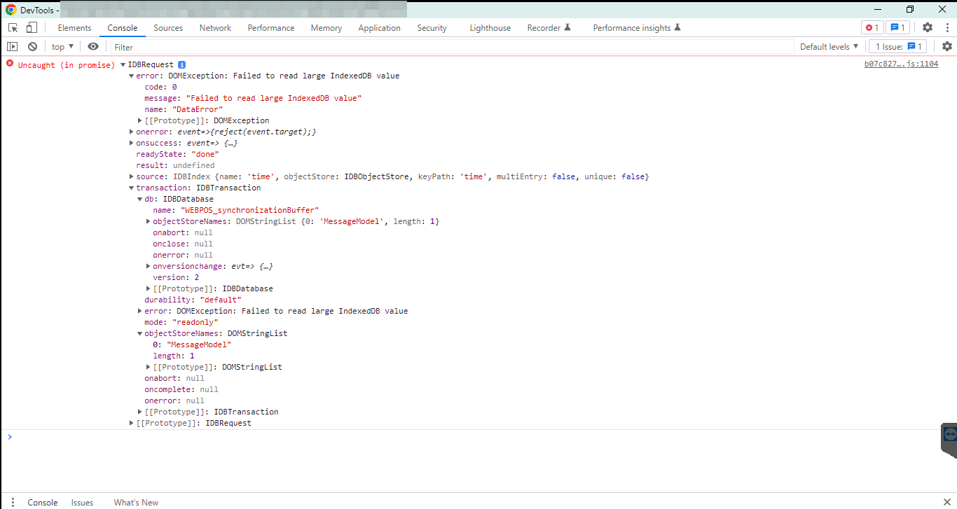 | Steps To Reproduce | Go to log in page: login page is not loaded Error in the console: Uncaught -> IDBRequest {result: undefined, error: DOMException: Failed to read large IndexedDB value, source: IDBIndex, transaction: IDBTransaction, readyState: 'done', ...} Commands used to extract the pending information to be synchronized: await OB.App.MessageModelController.findAll(); With this command, we obtain all the registers, which we copy, and paste into VCode and we see the giant problematic register, which we obtain its id and with the following command we eliminate it: await OB.App.MessageModelController.delete('ID OF THE PROBLEMATIC RECORD'); | |||||||