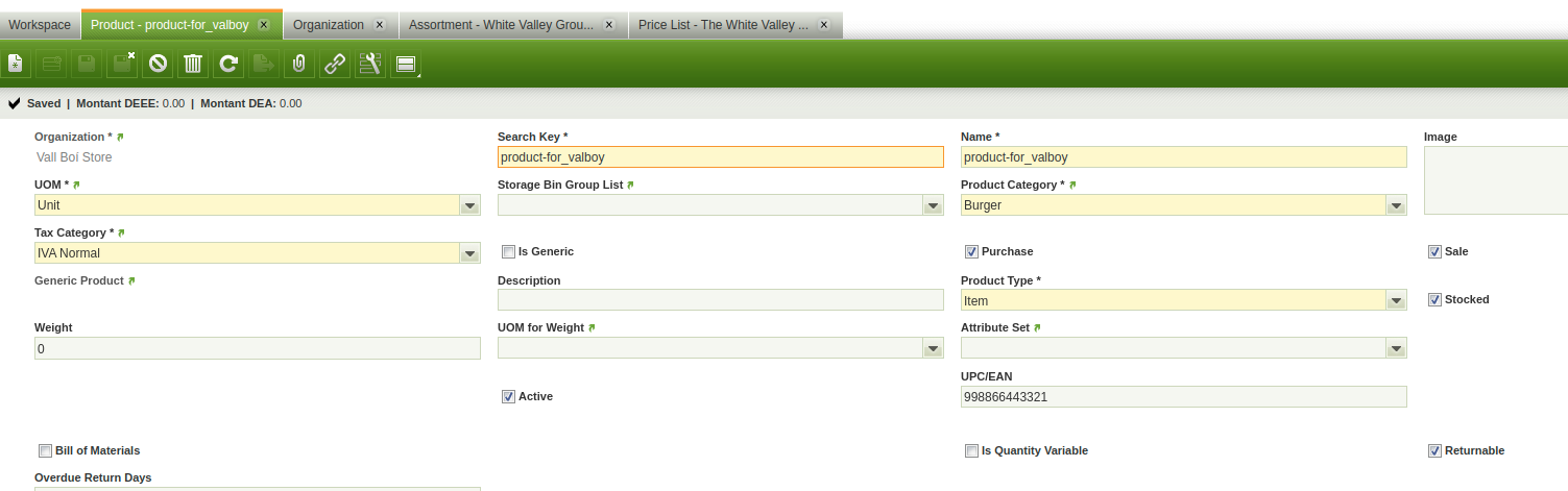 | Description | on livebuil created a product at "val boi" organization : product.png this product has been added to the price list version "The White Valley Group Sale Price List Version" and added to the assortment "White Valley Group Product List" when connected to valblanca store we see this product in the search product | |||||||