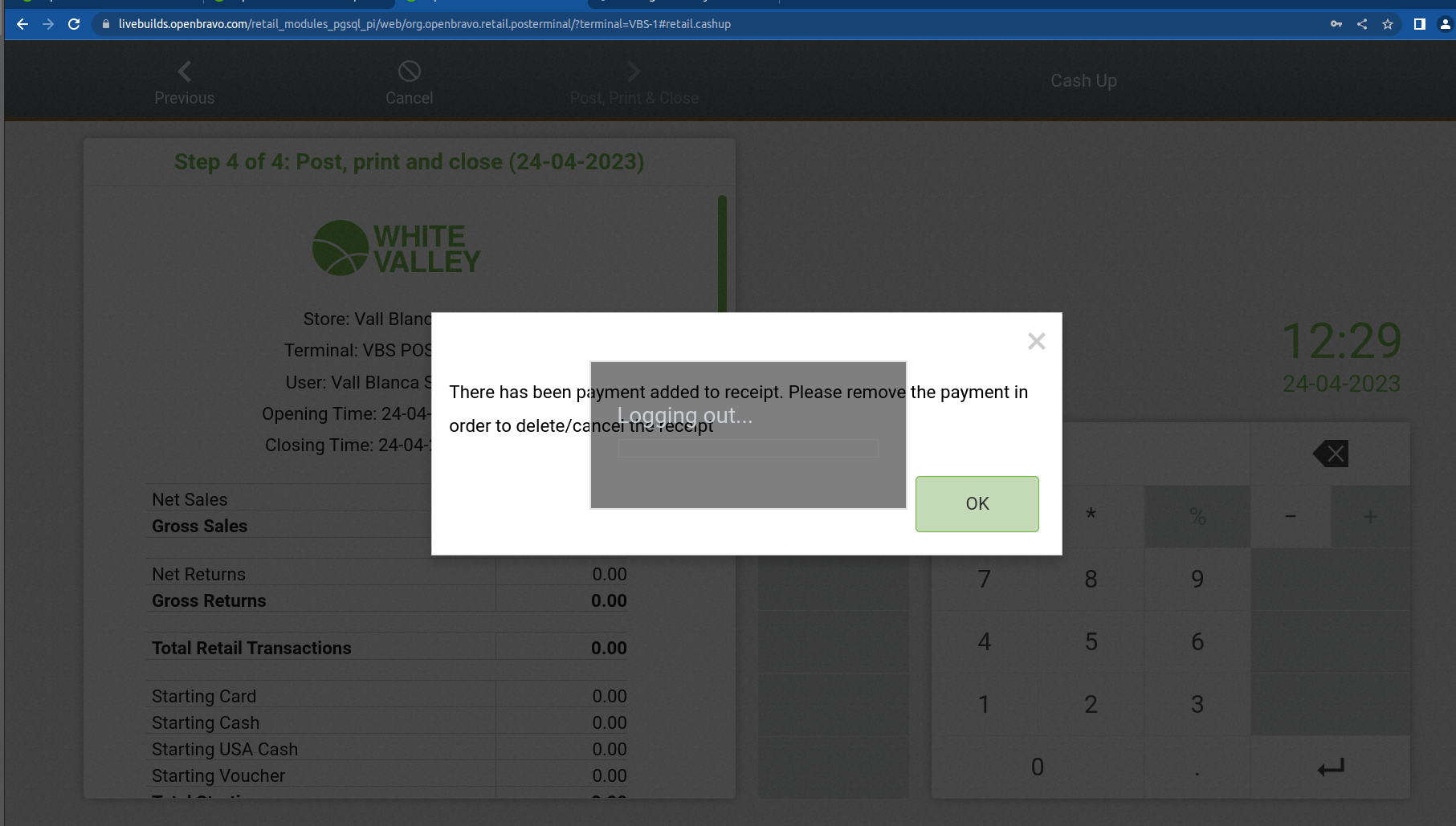 | Steps To Reproduce | 1. Open a terminal: https://livebuilds.openbravo.com/retail_modules_pgsql_pi/web/org.openbravo.retail.posterminal/?terminal=VBS-1 [^] 2. Add a product 3. Add a payment 4. Delete the line-previous product 5. Try to make the cashup Result: an error appears in the last step: "There has been payment added to receipt. Please remove the payment in order to delete/cancel the receipt" and the "logging out" pop-up stays open. See attached image. | |||||||