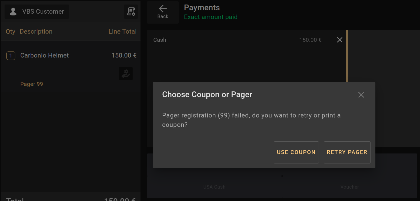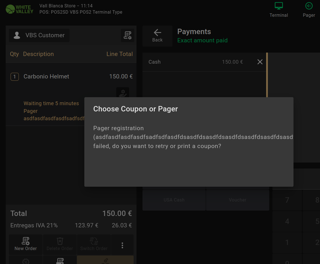 | Steps To Reproduce | Prerequisites: - Login in the backoffice - Go to the "Organization" window and select "Vall Blanca Store" record - From the subtab "Delivery Control" 2 records will appear, Coupon and Pager. - select "Pager" and in the "Webservice URL" field put any url like localhost just to be sure that the request will fail Steps: - Login in POS as vallblanca - Click "Ski" Category - Add "Carbonio Helmet" to the order - Select any "Waiting time" you want and click "Next" - Write with your keyboard a really long code. Important not to include numbers in the code - Click on "Validate and Continue" - Tap on "Pay" button, then "Done" A pop-up will appear with the title "Choose Coupon or Pager", but because the pager code is too long, there is no option to choose | |||||||