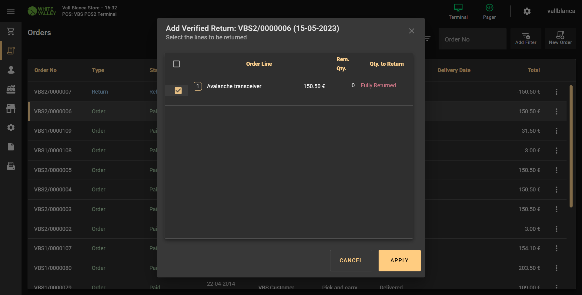 Go to Orders menu, click on the 3 dots of the first sale already returned and select Verified Return