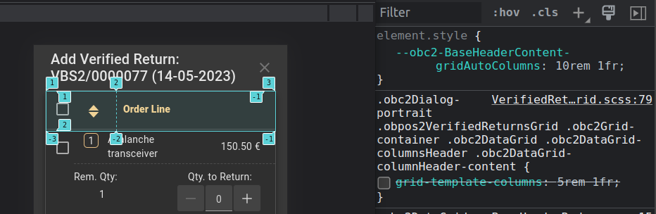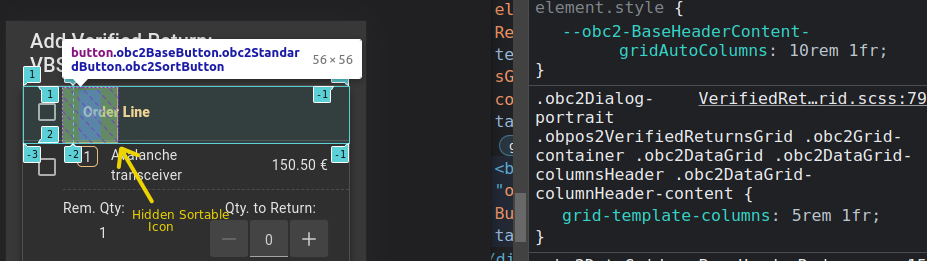 | Steps To Reproduce | *Sortable if true in portrait - Temporal Fix on Issue 52286 - Login - Open Orders window - Select an order and open verified returns. At first, there is no alignment problem, but we should inspect hoy many buttons are on the checkbox header inside, and we would discover a hidden sortable icon. An overwriting CSS rule in grid is hiding this element. | |||||||