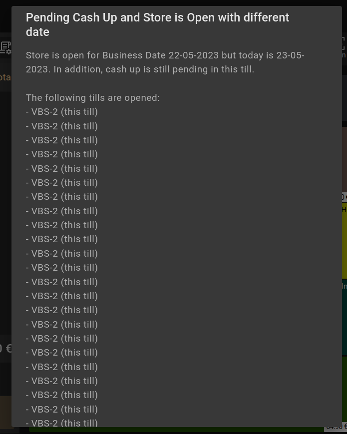 | Description | At the beginning, pending Cashups Dialog appears because some could be opened. If several Tills are on the list, the Dialog is not adapted to be scrollable and the user could be blocked. | |||||||