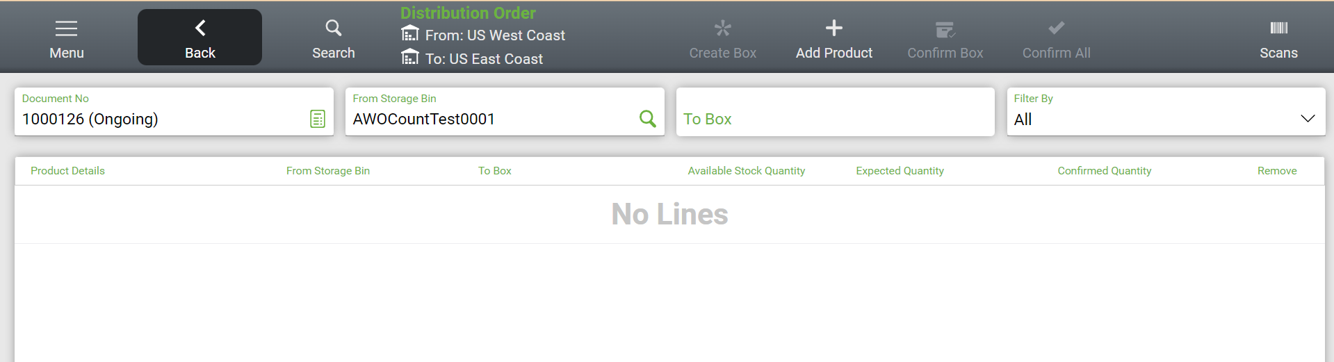Test Plans: Test 1: 1. Log in to AWO with AWO-QA profile and switch to US West Coast warehouse. 2. Create a DO. In the DO view, select Back -> No and return to the main window. 3. Go to Menu -> Distribution Order -> select the Ongoing DO. 4. Go to Search, select Remove, and close the "Distribution Order" pop-up. The app should redirect to the main window. Test 2: 1. Log in to AWO with AWO-QA profile and switch to US West Coast warehouse. 2. Create a DO. In the DO view, select Back -> No and return to the main window. 3. Go to Menu -> Distribution Order -> select the Ongoing DO. 4. Go to Search, select Remove, and select "New Distribution Order". The app should show the "Select Restrictions" pop-up. 5. In the "Select Restrictions" pop-up, select "Back". The app should show again the "Distribution Order" pop-up. 6. Select again "New Distribution Order" and, in the "Select Restrictions" pop-up, select the X. The app should redirect to the main window. Test 3: 1. Log in to AWO with AWO-QA profile and switch to US West Coast warehouse. 2. Create a DO. In the DO view, select Back -> No and return to the main window. 3. Go to Menu -> Distribution Order -> select the Ongoing DO. 4. Go to Search, select Remove, and select "New Distribution Order". The app should show the "Select Restrictions" pop-up. 5. Create the DO. The view should update to reflect the new DO. |