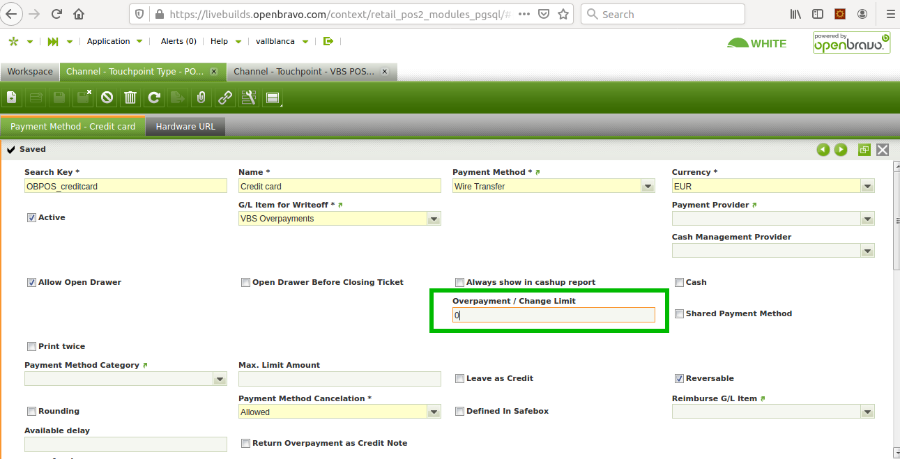 | Steps To Reproduce | In Live Builds, in touchpoints VBS-2 1) First make sure that the payment method CARD you indicate Overpayment = 0 (see image attached) https://livebuilds.openbravo.com/context/retail_pos2_modules_pgsql/?tabId=4D9F5E9CC0014A96861CEFB64BBF013B&recordId=DA57972154C04D0B9A399A06237C64AC [^] 2) In POS do a new ticket with user vallblanca https://livebuilds.openbravo.com/context/retail_pos2_modules_pgsql/web/pos/?terminal=VBS-2 [^] 3) Add 2 lines to the ticket with products: * Balaclava Cap * Hiking boots * Total of the ticket 338€ 4) Add payment method CARD for Amount = 500€: you get a message saying that you can't do overpayments for that payment method, this is correct OK 5) Enter now 338€ on CARD payment method 6) Before finalizing the ticket, remove the product Balaclava Cap 7) You are able to finalise DONE the ticket with an Overpayment in CARD payment method, which should not be allowed, this is the error KO See video with sound https://drive.google.com/file/d/1iNjvsFyr0HuJeBgXbP4S61iGd3EPYy5U/view?usp=share_link [^] | |||||||