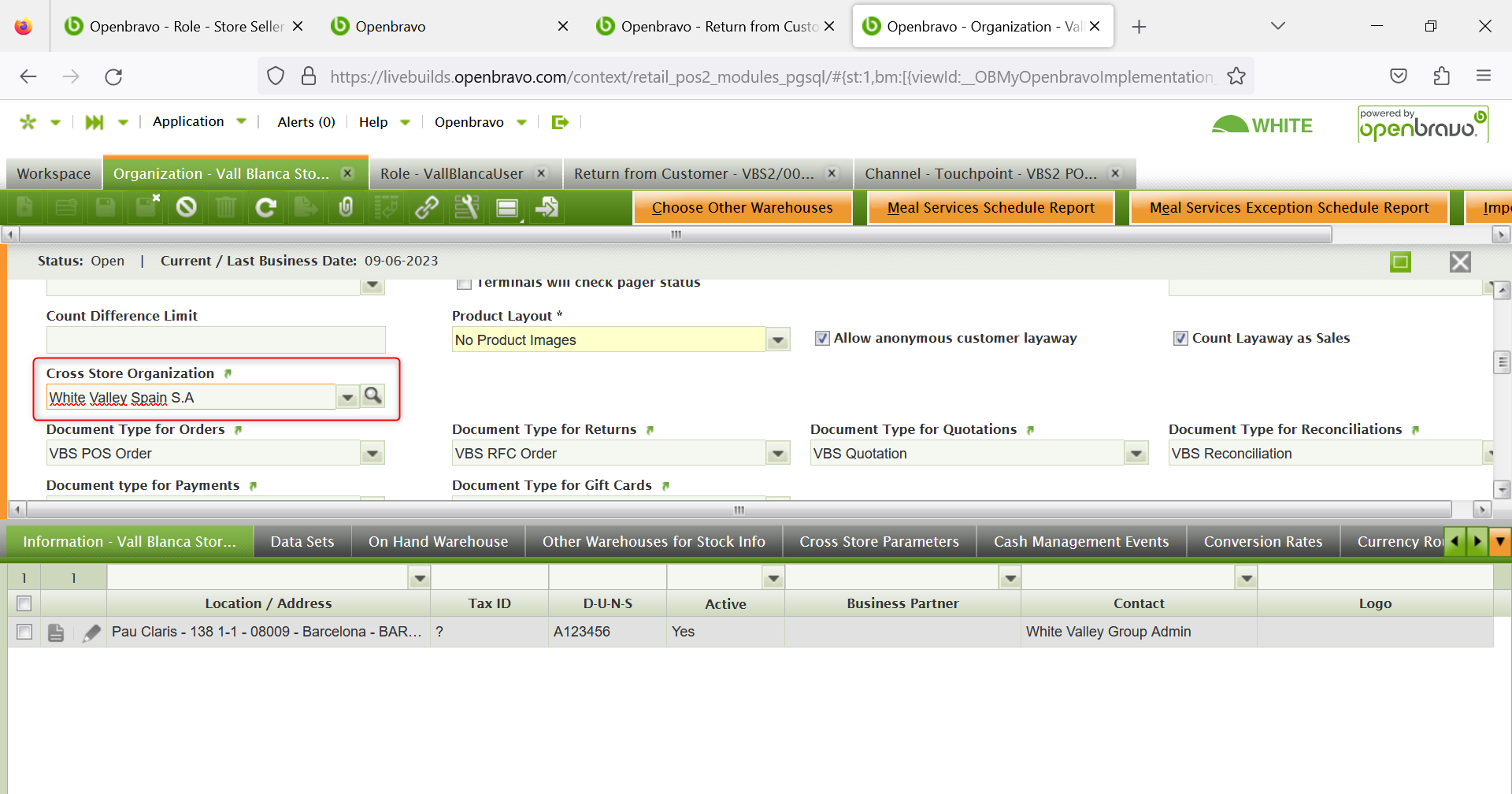 (window 'Organization', 'Cross Store Organization' = 'White Valley Spain S.A' for both - see Organization cross store.png)