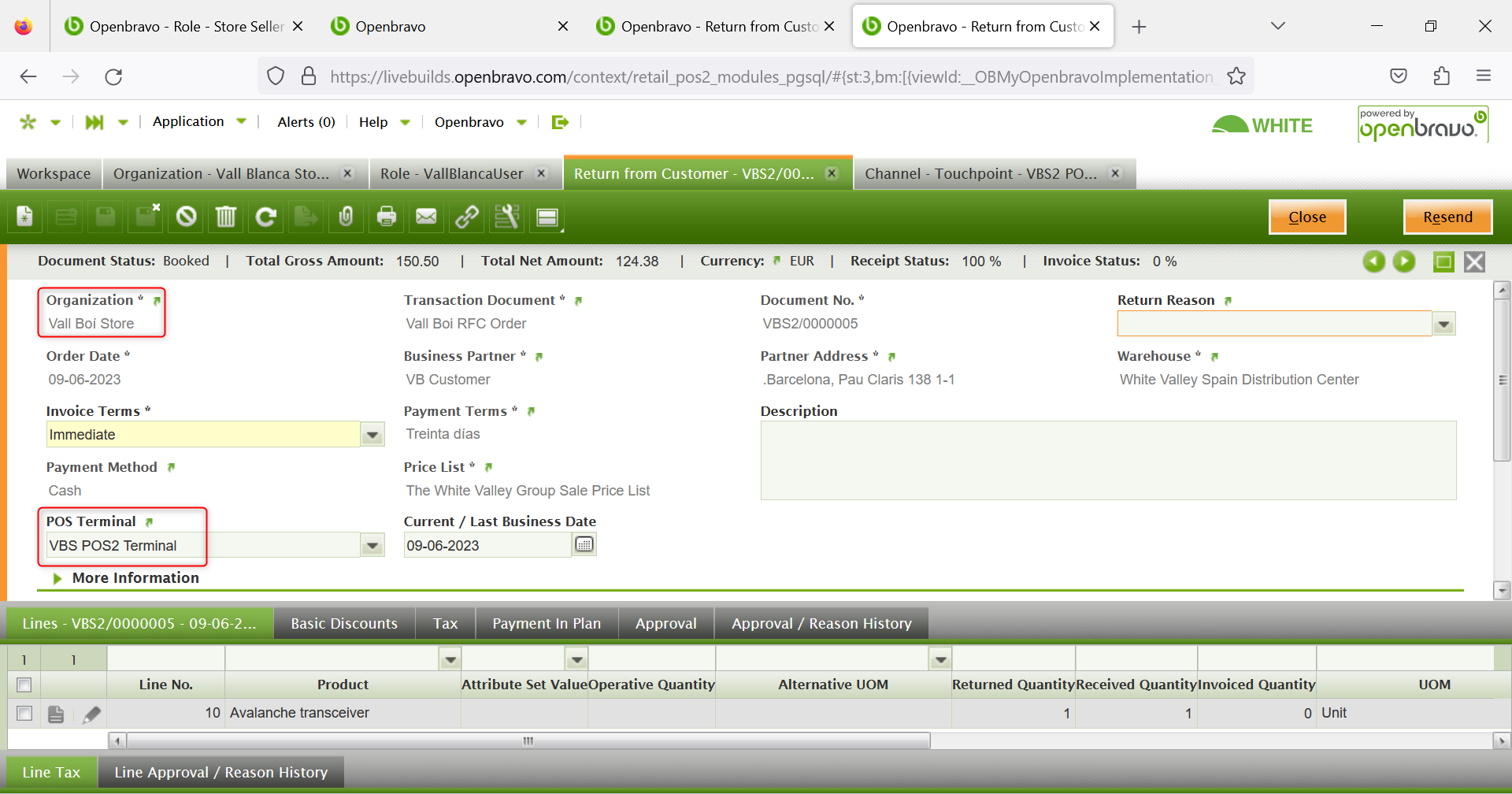 In the BO, the organization for the verified return is Vall Boi and the touchpoint is the one of Vall Blanca