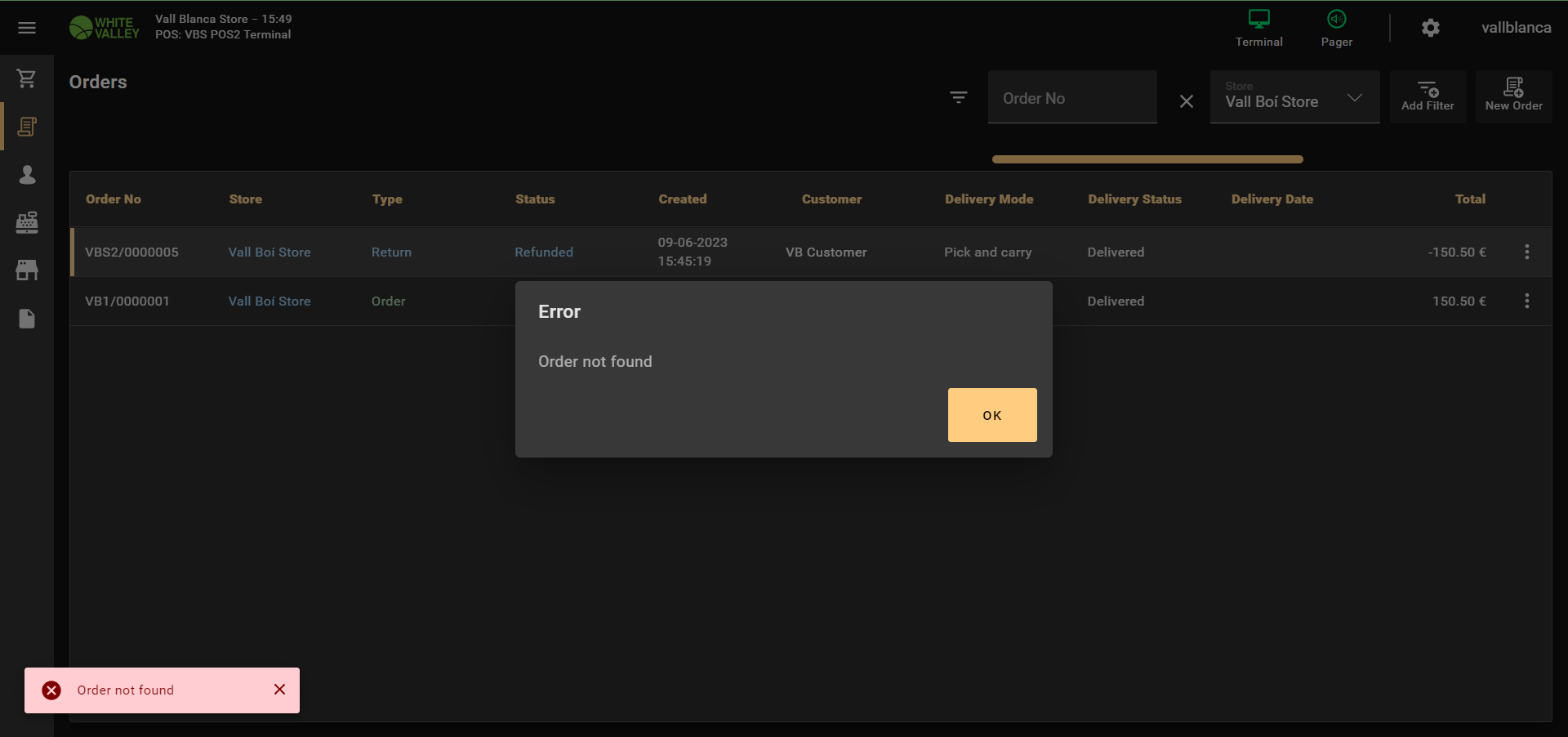 => Error 'Order not found' even if the return was actually made on Vall Blanca