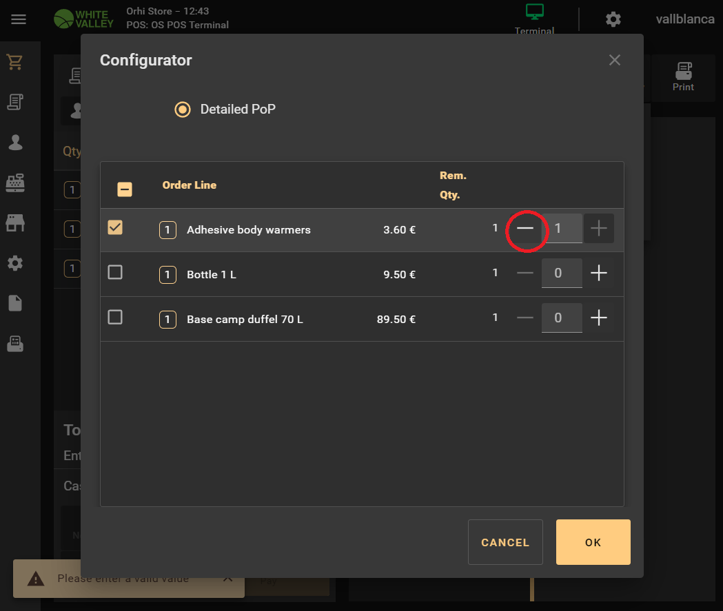| Steps To Reproduce | 1. Open a delivered ticket's Proof of Payment window 2. Create a new one using the "Select products from order" option 3. The product selector is shown 4. Click the '+' in one product 5. Click the '-' in the same product and see in the background a message about a non-valid value 6. In order to return the value to zero, the check field at the left has to be unmarked Repeat steps 3 to 6 in the Verified Returns window and check what is the expected behavior. | |||||||