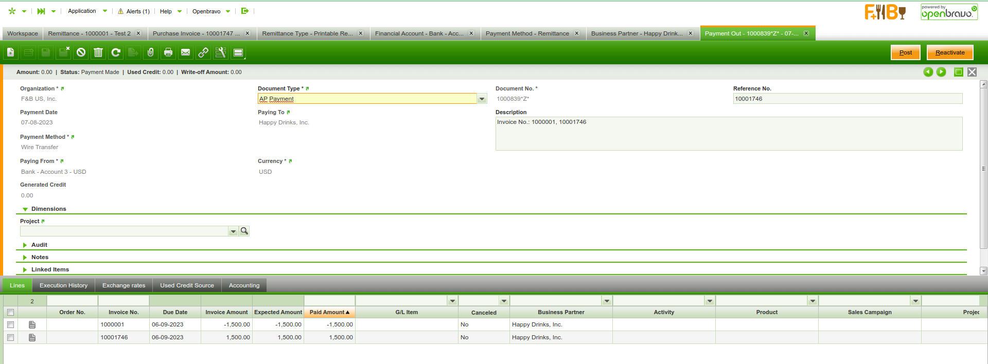 | Steps To Reproduce | Video with the steps (In Spanish): https://drive.google.com/file/d/167KYJVszplyWLjoCY-6bNg_kcsrsxA9c/view [^] With the basic remittance configuration provided in the wiki in the F&B client perform the following actions: 1 - Create an invoice in the 'Purchase Invoice' window with a remittance-capable payment method or 'Remittance' and complete it. 2 - In the 'Remittance" window, create a new remittance. Add the previously created invoice from the 'Select Orders or Invoices" button and process the remittance. 3 - Go to the invoice created, from the button 'Reactivate' proceed to cancel it, selecting the option "Void". 4 - Verify that a new cancellation invoice is created, it appears as paid when the original one is not. If we verify the details of your payments, we will find a payment in negative, if we browse it, we will see that the amount is 0 and a negative credit is generated that the business partner never gets. | |||||||