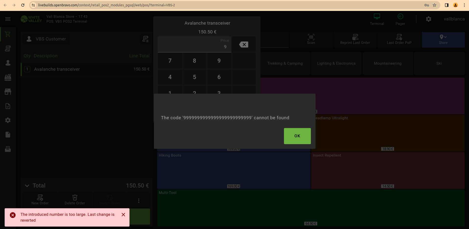 | Steps To Reproduce | 1) Log in POS2 2) Add any product to the ticket 3) Select the line that has been added to the ticket 4) In the popup, select 'Price Modification' 5) Type a large number, such as 999999999999999 6) Click OK 7) In the popup, click the + button until you have a quantity of 6 8) Close the popup 9) Click Pay, then Cash and then Done 10) Repeat steps 2-9 (because the application will not let you pay all twelve products at once due to the high amount of money) 11) Go to Close Till 12) Click on 'Match Expected' => The error message appears 9) | ||||||||||