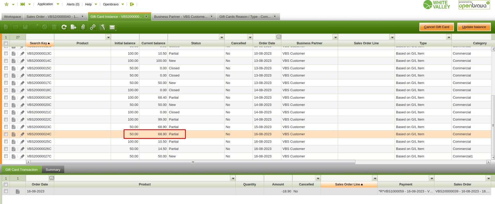| Description | When I pay for an Order using a Gift Certificate and then reverse it, I notice that the current balance of this Gift Certificate ('Gift Card Instance' window in Backoffice) increases by the total order amount. Create a Gift Certificate: 1.Log in to POS2: -username: vallblanca -password: openbravo 2.Go to Main menu -> Restaurant -> Gift Cards / Credit Notes / Gift Certificates 3.Click the 'Create Gift Certificate' button 4.Enter the following values: - Gift Card Category: Commercial - Expiration Date: A date in the future - Amount: 50 Push 'Create' button Go to Backoffice (username and password - openbravo) -> 'Gift Card Instance' window -> Write down the 'Search Key' of the created Certificate (will be used in POS as Card ID) | |||||||
