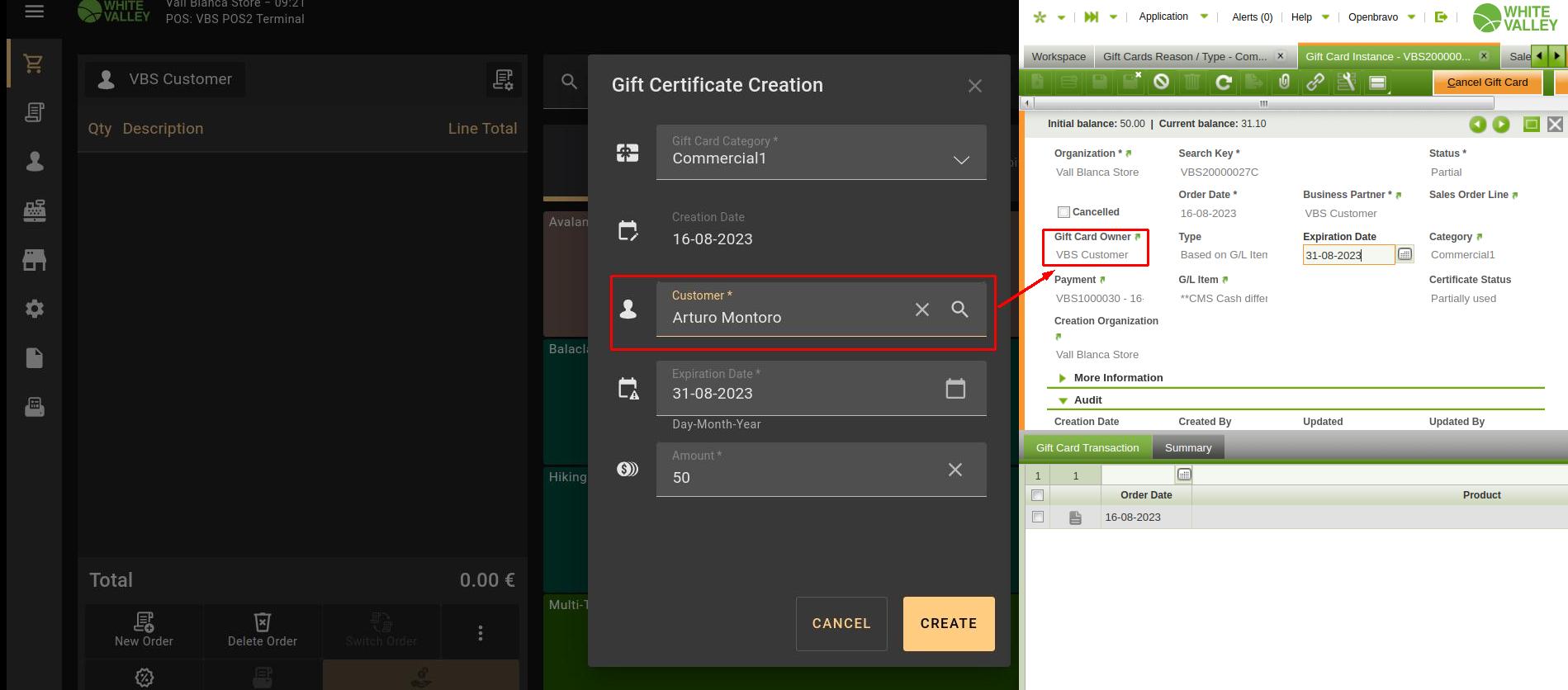 | Steps To Reproduce | 1.Log in to POS2: -username: vallblanca -password: openbravo 2.Go to Main menu -> Restaurant -> Gift Cards / Credit Notes / Gift Certificates 3.Click the 'Create Gift Certificate' button 4.Enter the following values: - Gift Card Category: Commercial - Customer: Arturo Montoro - Expiration Date: A date in the future - Amount: 50 Push 'Create' button 5.Go to Backoffice -> 'Gift Card Instance' window 6.Open created Gift Certificate Actual Result: VBS Customer is displayed as Gift Card Owner if create Gift Certificate with Arturo Montoro Customer Expected Result: Arturo Montoro is displayed as a Gift Card Owner if create Gift Certificate with Arturo Montoro Customer | |||||||