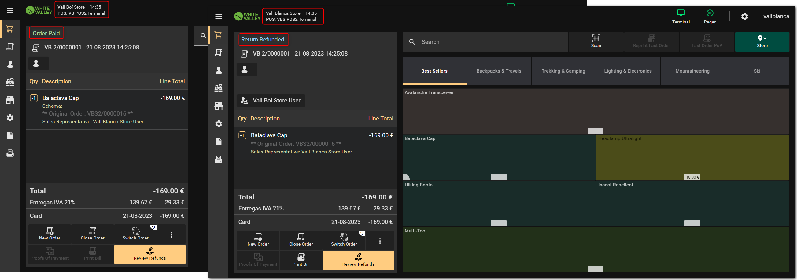 | Steps To Reproduce | Cross Store is configured for Vall Blanca and Vall Boi stores In POS, store Vall Blanca Finalize a sale In POS, store Vall Boi Finalize a verified return on the previous sale Open the return => status of the return is "Order Paid" In POS, store Vall Blanca Open the return made on Vall Boi => status of the return is "Return Refunded" See Return status on two stores.png | |||||||