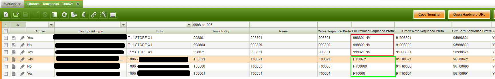 Copy Store currently generates the prefixes for the different document types in the following way: - If the original terminal has an empty prefix, the new one has an empty prefix too - If the original terminal had a non-empty prefix, the new one gets a prefix composed of the new search key, plus a sufix concatenated. This sufix depends on the document type (for example, quotations get QT, full invoices get INV, returned orders get R, ...). This is the way it was designed to work. If you want to change it, it should be discussed with Product Management. For example, a possible suggestion would be to be able to configure these sufixes used in the Copy Store configuration. |