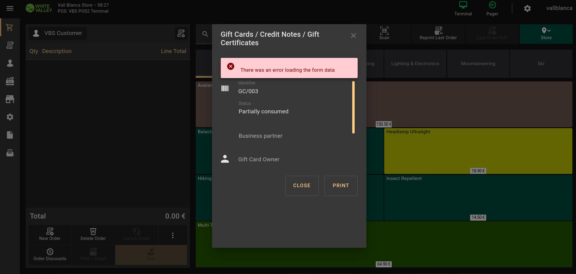 DescriptionIf I create and sell Gift Card, then open it's info from the 'Select Gift Cards / Credit Notes / Gift Certificates' pop-up, 'There was an error loading the form data' is displayed