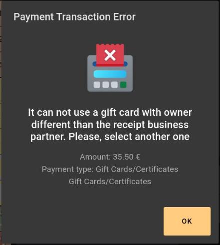 'It can not use a gift card with owner different than the receipt business partner. Please, select another one