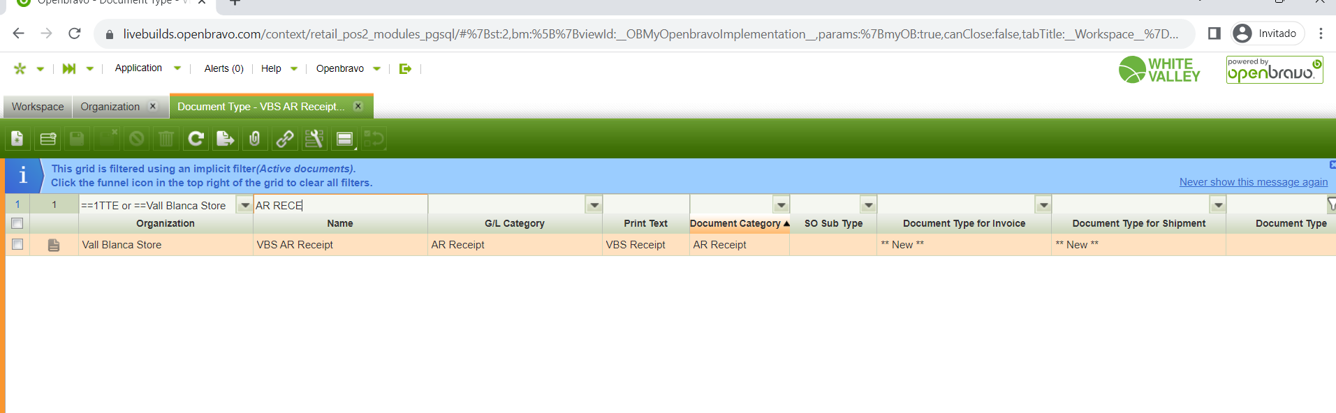 1. Check document types of Vallblanca store-->See it has a document type AR Receipt.