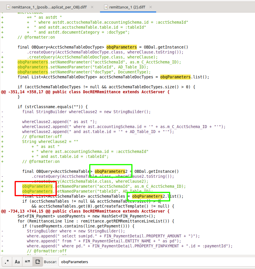 DescriptionThe customer has detected that in the diff corresponding to mantis 51594 there is a parameter setting error. The OBQuery above is being used to assign the parameters in the one below. As far as we have been able to see, the red part has to go with "obqParameters2" and not "obqParameters". Attached is a screenshot.