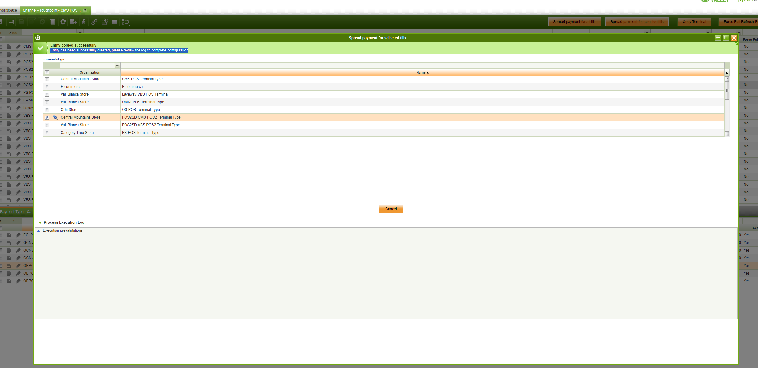 | Steps To Reproduce | 0-Login Openbravo Backoffice inside a context with Copy Retail Store module installed. 1-Go to Channel - Touchpoint window, select E-commerce record and go to Payment Type tab. 2-Select EC_PuchaseOrder record and, at the top right of the screen, click "Spread payment for selected tills" process. 3-Inside the "Spread payment for selected tills" popup, select "POS2SD CMS POS2 Terminal Type" record and click Done button. Dissmis that popup clicking "Cancel" button. 4-Again, at the top right of the screen, click "Spread payment for selected tills" process. 5-Again, inside the "Spread payment for selected tills" popup, select "POS2SD CMS POS2 Terminal Type" record and click Done button. DEFECT: Message "Entity copied successfully Entity has been successfully created, please review the log to complete configuration" is shown, but nothing has been created. | |||||||||||