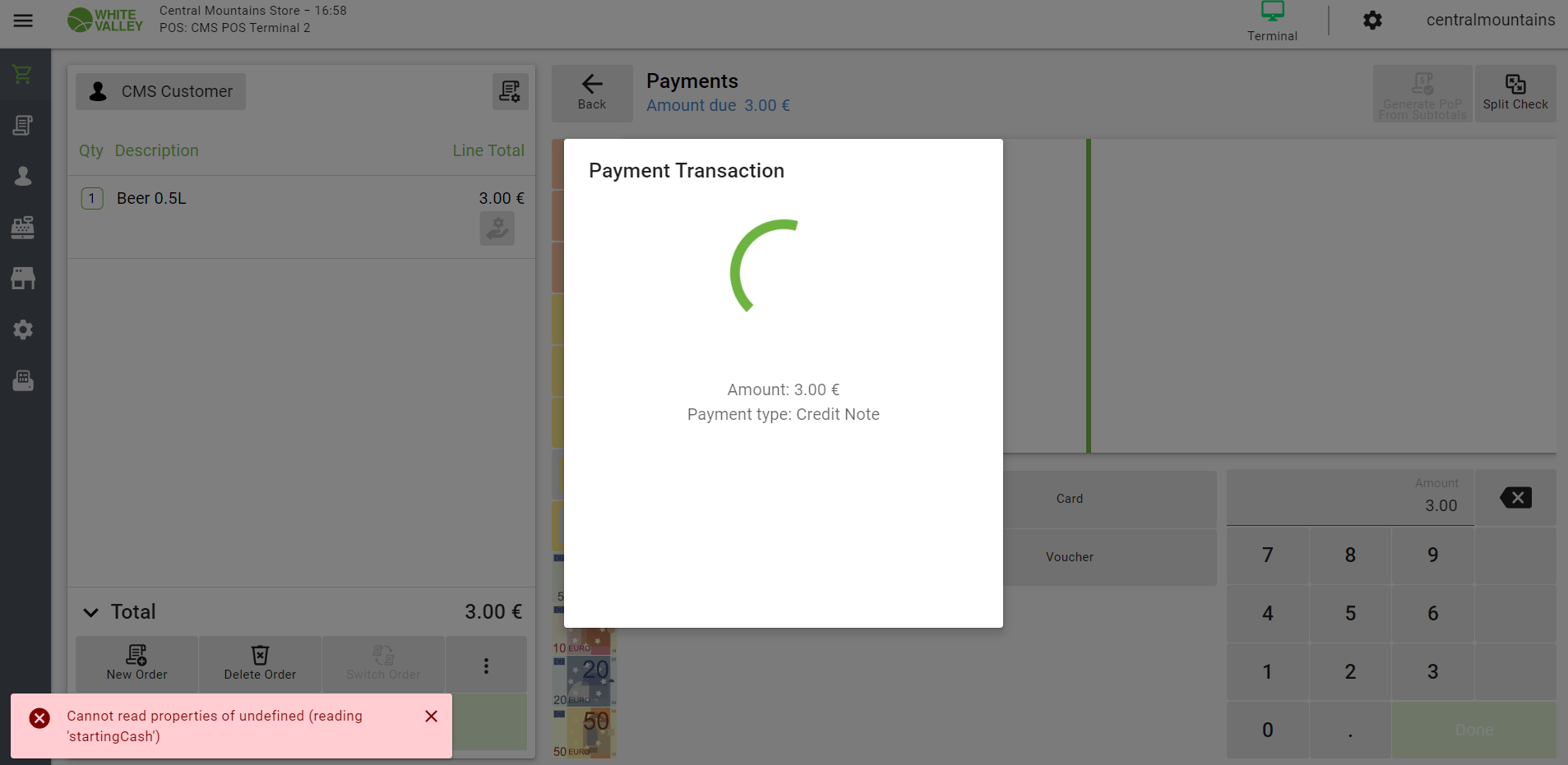 4-Now, login POS2 CMS-2 terminal, add 1 product to the empty ticket and try to pay it using Credit Note. DEFECT: Realise it gets stuck and a reload is required to continue.