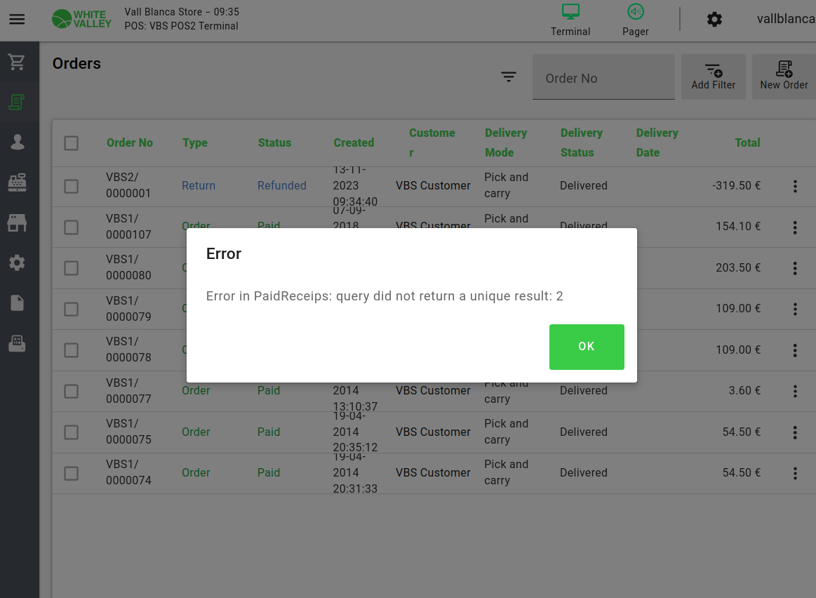 | Steps To Reproduce | 1- Login POS2. 2- Create a new ticket with two products( you can choose what you want). 3- Click in return line button for the two products and try to fill in the inputs in return line dialog. 4- Go to order window and click on the ticket that you did. An error showed "ERROR in PaidReceipts: query did not return a unique result:2". | |||||||