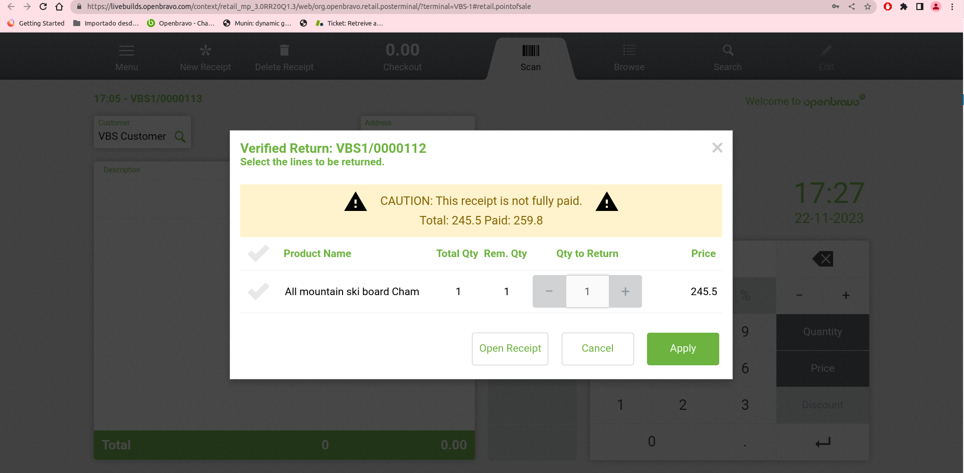 | Steps To Reproduce | Configure COnversion Rate USD TO EUR with the divide less than 1 Also change the settings of the USD Cash method with the payment method for example "Specials " (remember to add the payment method in the related financial accounts). Login to POS terminal. Select a product. Do a partial payment in cash EUR. Pay the remaining amount in cash USD. Check that the (amount paid in EUR) + (amount paid in CHF) < (total amount). (TAKE INTO ACCOUNT THE COVERSION RATE) Complete the sale. Open the previous receipt. Press the ‘Retrun this receipt’ button or do a verified return Check the popup message | |||||||