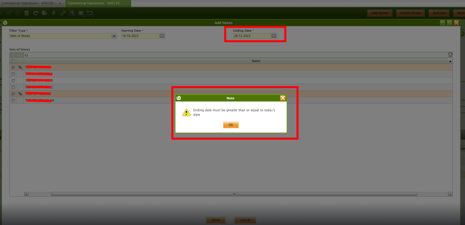 | Steps To Reproduce | Steps to reproduce. Go to “Store set” window and define a regular store set S1 active with: store A set as active and with starting date DA1 > D2 (in the future regarding OPECOM) store B set as active and with starting date DB1 = D and ending date DB2 = D (today) store C set as active and with starting date DC1 = D1 and ending date DC2 = D2 (same dates as OPECOM) store E set as active and with starting date DE1 < D1 and ending date DE2 < D2 (in the past regarding OPECOM 2. Define a regular store set S2 active with: store F set as active and with starting date DF1 and ending date DF2 < D1 (in the past regarding OPECOM) store G set as active and with starting date DG1 < D1 and ending date DG2 > D2 (OPECOM included) store H set as active and with starting date D < DH1 < D2 (included in OPECOM but later than today) store I set as inactive and with starting date DI1 < D1 and ending date DI2 > D2 (OPECOM included) 3. Go to the “Commercial operation” window. 4. Create a commercial operation with starting date in the past regarding today's date, and ending date in the future regarding today's date. 5. Click on “Add Stores” button and select “Sets of stores” in the filter type → See that the dates are automatically fulfilled with starting and ending date of the OPECOM. 6. Select those 2 stores sets. 7. Click on “Done”. → See the following message on the screenshot (from the 22th of Nov) | |||||||
