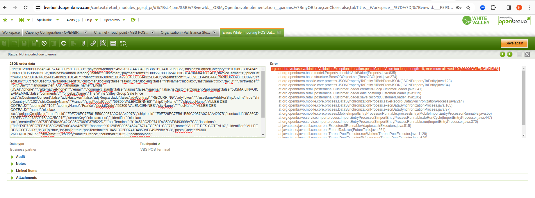 org.openbravo.base.validation.ValidationException: Location.postalCode: Value too long. Length 18, maximum allowed 10 [59300 VALENCIENNES]