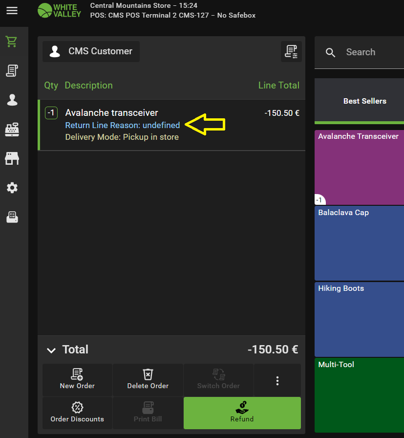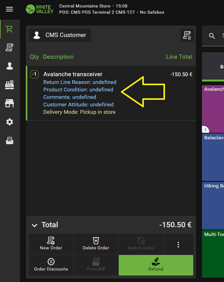 | Steps To Reproduce | Configuration: 0-Login POS2 backoffice and go to "User Action Input" window. 1-Deactive all records except the following one: "User Action": "Return Line" "User Input"": "Return Line Reason". 2-Enter the previous aforementioned (in Step 1) record and set "Mandatory" as False and Active as True. Save the modifications. POS2 flow: 1-Login POS2 using CMS-2 terminal and centralmountains as user. 2-Add 1x "Avalanche transceiver" to the ticket. 3-Click the just added product line and, in the overlay, click "Return Line" button. 4-Without choosing value, click OK button. DEFECT: Realise "undefined" is shown as value in the ticket line (check attached images to see current and old behaviour). | |||||||