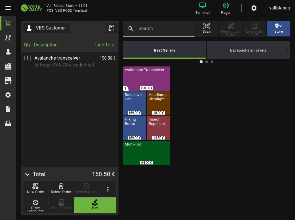 1-Login POS2 using the VBS-2 terminal and "vallblanca" user
