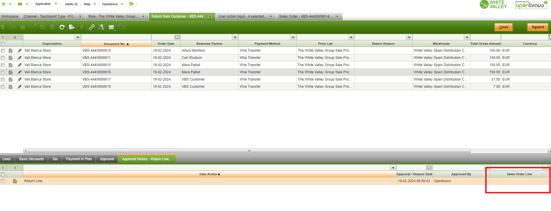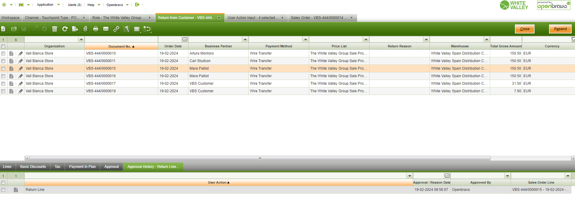 1- In the backoffice, update permissions to the VallBlancaUser role, so that it requires approval when executing the "Return Line" action.