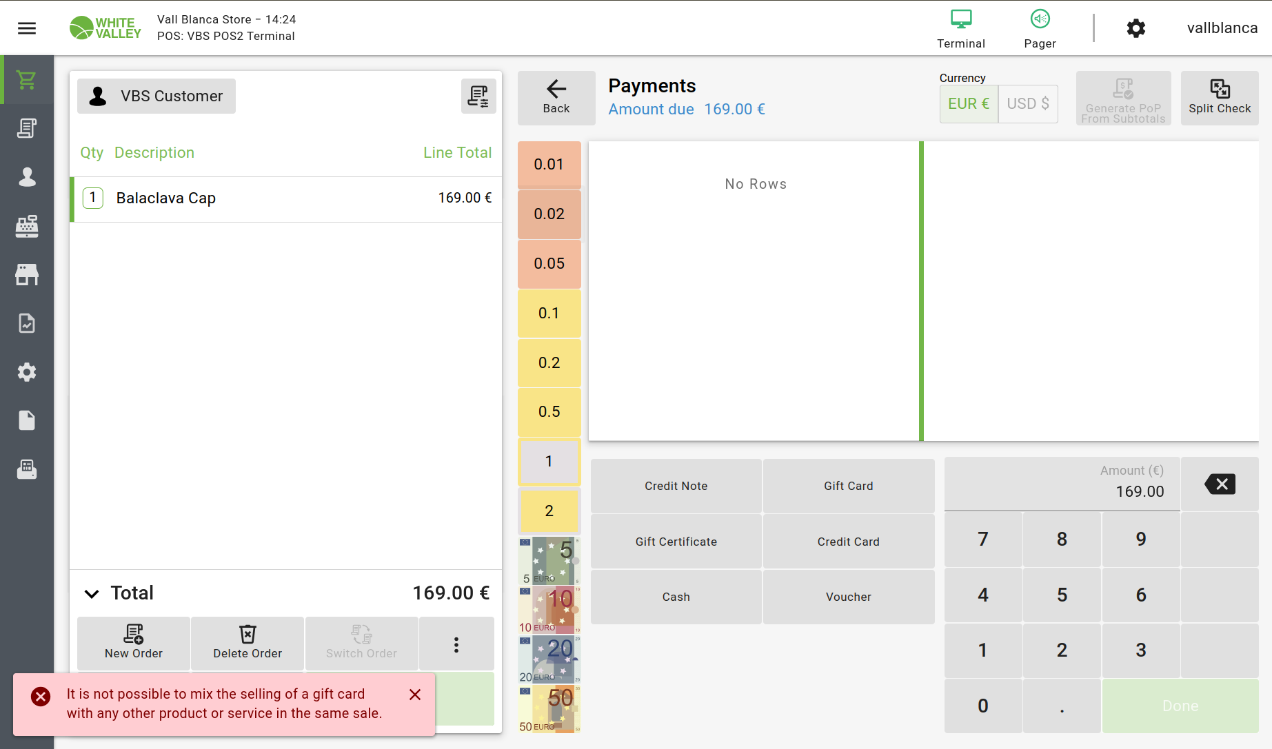 DescriptionWhen paying an order with a gift card, if that gift card is configured to appear as a negative line in the order instead of as a payment line, the system detects that you are trying to pay for the gift card in the same order as the products, which is not allowed to do. So an error message appears informing about that it is not possible to sell a gift card with any other product in the same sale, and then the gift card disappears and it is no longer usable.