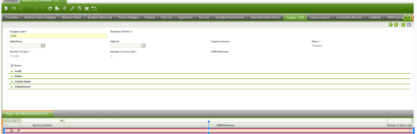 | Steps To Reproduce | ERP Config - Login ERP as user: Openbravo / Pass: openbravo - Go to "Discounts and Promotions" window - Edit "2 x 1 - Ski Touring" discount, check "Use Coupon codes" & Save - Click on "Coupon" Tab for this discount - Click Ctrl + D to create new record → Specify the following details: - Coupon Code: 1234 - Number of Uses: N Uses - Number of Uses Limit: 1 - Click Ctrl + S to save the discount POS steps - Log in to POS using - User: Vallblanca - Password: openbravo. - Create a ticket with these items: - Ski touring bindings - Ski touring board Dyn - Click the three vertical dots button and select "Coupons" - Choose "Redeem Coupon" and enter "1234" and click "Redeem". The coupon should be applied. - Click "Back" - Click "New Order" - Add the same items as previous ticket - Click the three vertical dots button and select "Coupons" - Choose "Redeem Coupon" and enter "1234" and click "Redeem". The coupon should be applied. - Click "Back" - Pay the current ticket, ticket is correctly paid (OK). - Pay the previous ticket, ticket is correctly paid (NOK) Both tickets were paid with the same coupon, which is not supposed to happen. | |||||||