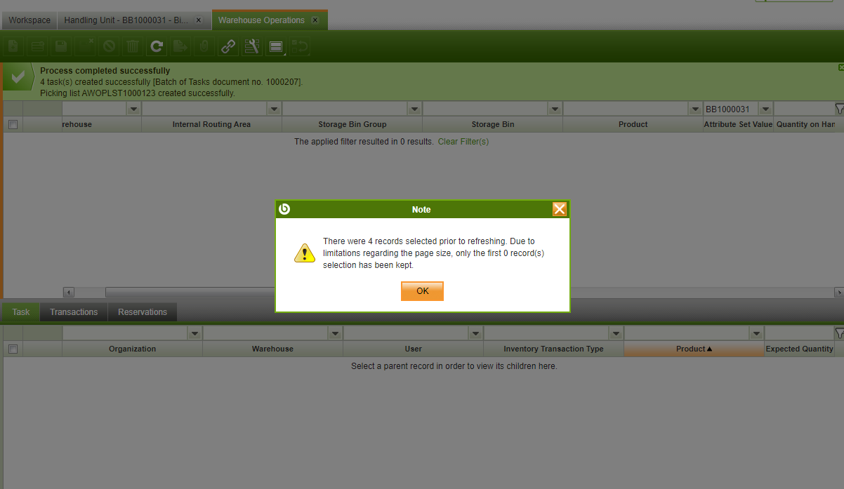 | Steps To Reproduce | 1. From SSMS/AWO create a new box containing four products 2. Go to Warehouse Operations window and filter by the ID of the created box 3. Select all the four records and unbox them The process finishes with success and a green message is shown in the background. However, a warning message pop up is shown. The message alerts the user about something that is not correct. It is not correct that 0 records are shown now instead of the 4 I had before because a page size limitation. | |||||||||||