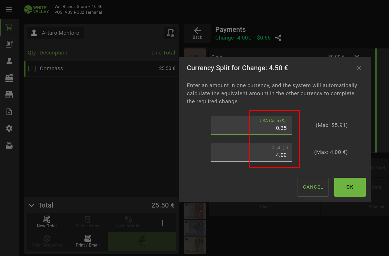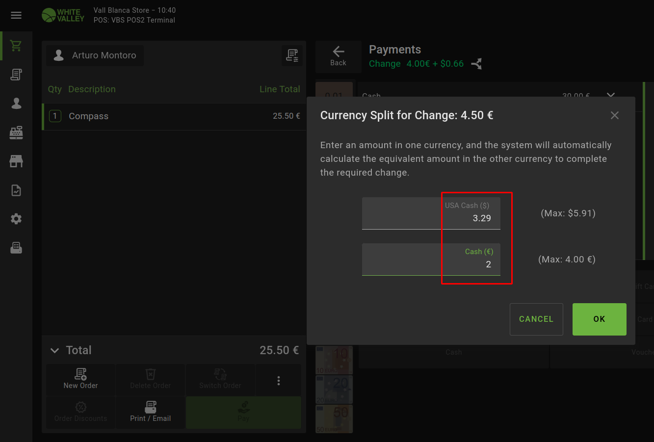 | Steps To Reproduce | 1.Go to POS2 (username:vallblanca/password:openbravo) 2.Select product with price 25.50 → Push 'Pay' button 3.Specify '30.00' amount in the keypad → Select 'Cash' payment method 4.Push 'Payment status' line (Change $0.66 + 4.00€) 5.Specify '0.35' in 'USA Cash' field' of the 'Currency Split for Change: 4.50 €' pop-up Pay attention to 'Cash' field value: The value remains unchanged (4.00) 6.Move the cursor to 'Cash' field → Specify '2' amount Pay attention to 'USA Cash' field value: The value is recalculated (3.29) | |||||||