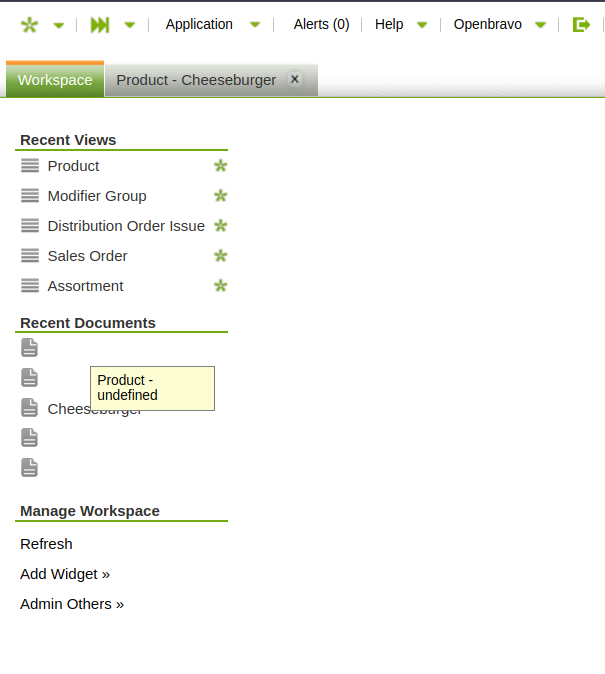 7. Navigate to the Workspace window and observe the most recent (topmost) record in the list titled "Recent Documents". Hover over the blank space and observe the help message "Product - undefined" (error)